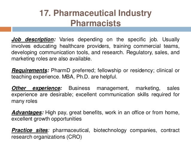However some pharmacists believe that they will be unable to secure a position in a pharmaceutical company without prior industry or research experience. Pharmaceutical industry itself consists of various and vast units like manufacturing quality control quality assurance drug regulatory affairs intellectual rights technology transfers research and development formulation and development analytical labs clinical research. Pharmacists research design develop and test new medicines and treatments ensuring their safety and quality.