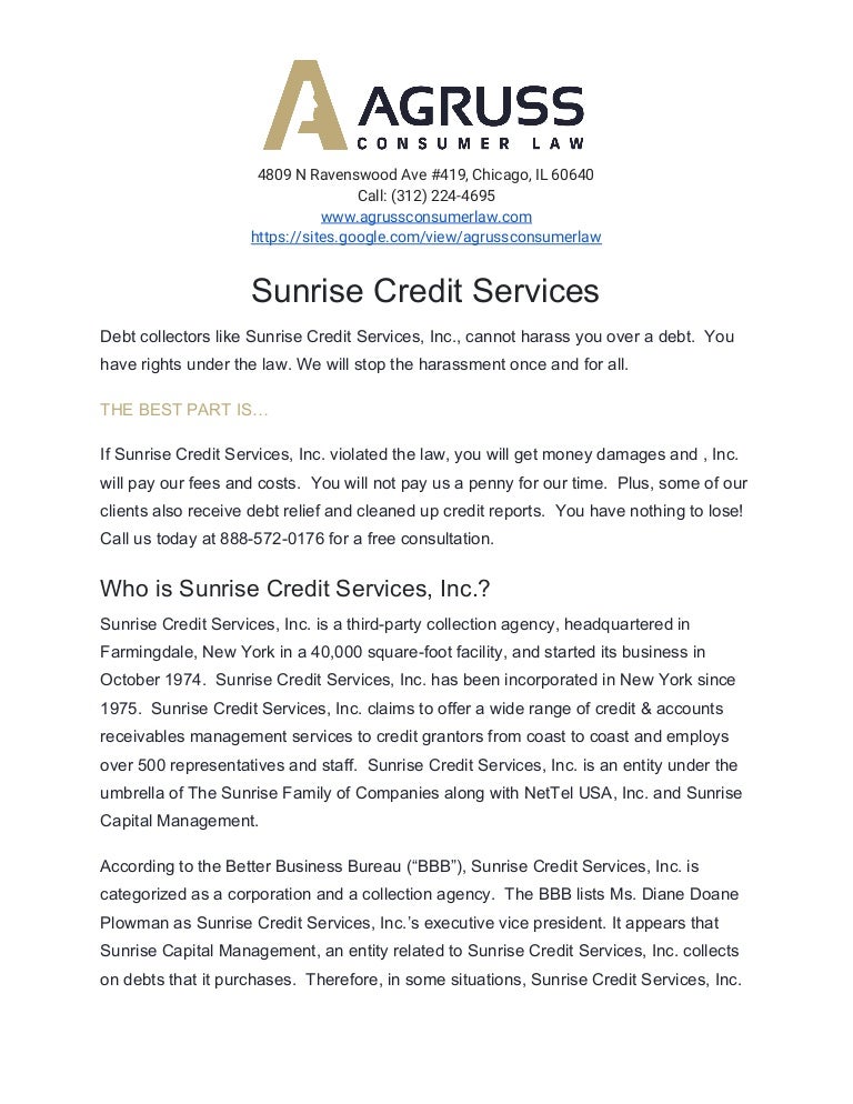 Get more info about Sunrise Credit Services Complaints related to your area Area. Finally after getting bothered enough they stated they were Sunrise Credit Services and wanted to. The latest review annoying debt collector.