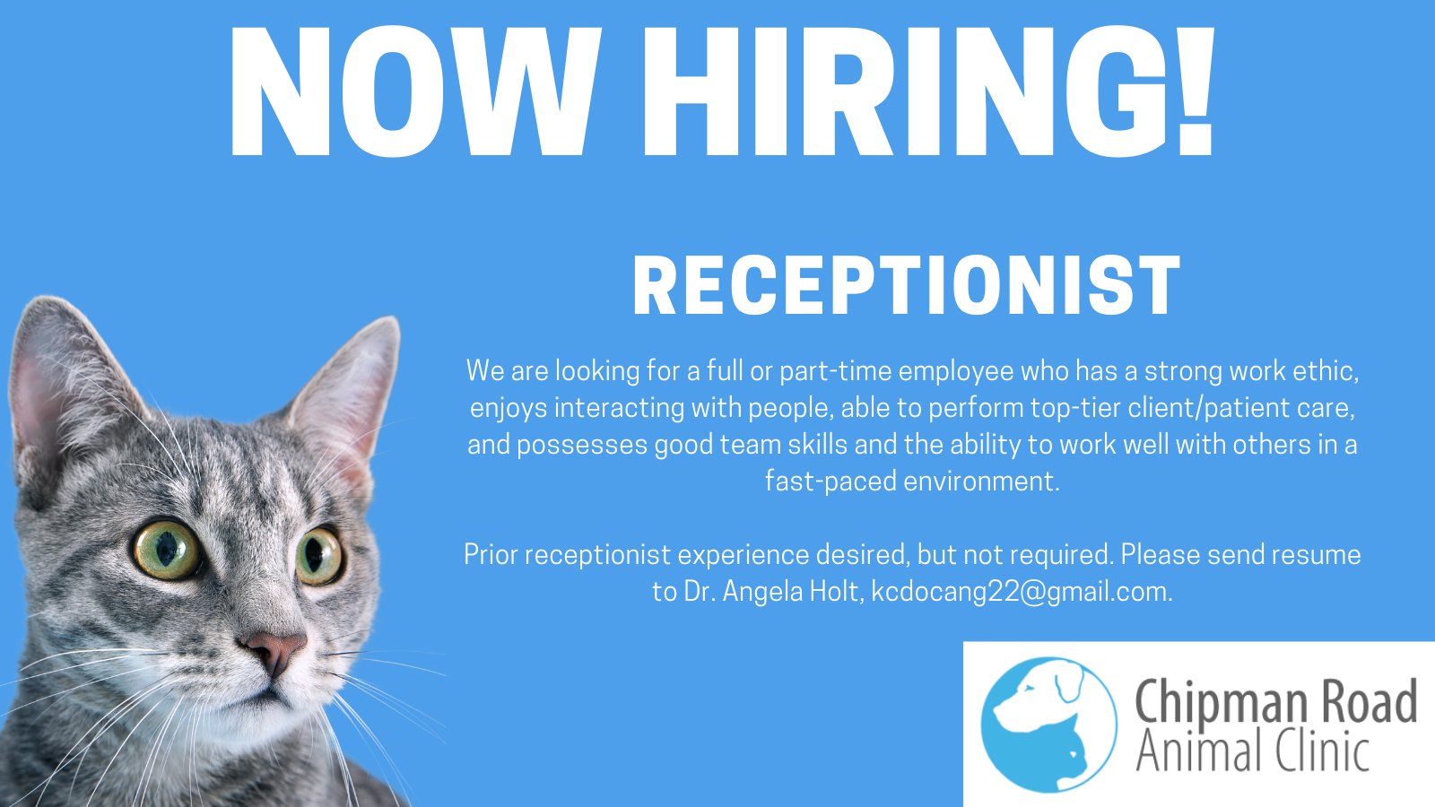 Chipmananimalclinic On Twitter Chipman Road Animal Clinic Is Searching For A Receptionist To Join Our Team We Offer A Very Competitive Employee Package Prior Receptionist Experience Desired But Not Required Please Send